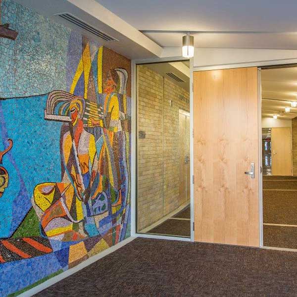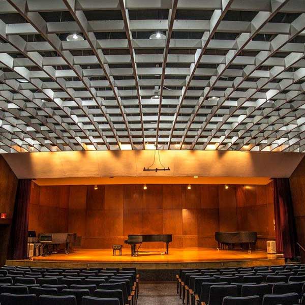 Wolfe Recital Hall received a makeover as well. The lobby was updated with a new entry vestibule, new carpets and acoustical ceiling panels and new lighting. The stage received a new wood floor, curtain and audio visual equipment. New HVAC equipment was added to an existing mechanical room.