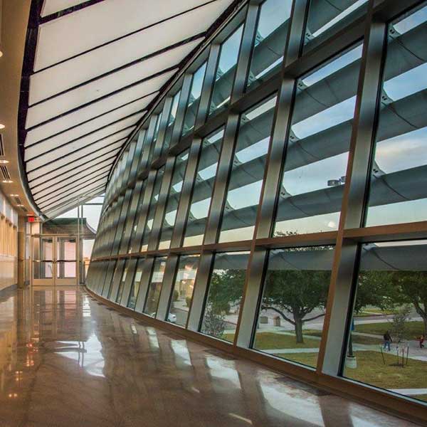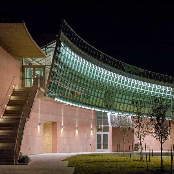 The new spaces house two recording studios, well-equipped, state-of-the-art control rooms, a large rehearsal room, dressing rooms, a green room, classrooms, a music technology lab, a sheet music library and small recording studios. The new 2-story music building addition also includes curved curtain wall systems, polished concrete floors, a chilled water system, acoustical cloud ceiling panels and acoustical wall panels. The new music building incorporates vast amounts of natural lighting and smooth, clean design. One of the most notable features of the new music building is the sweeping glass concave wall which provides an acoustic backdrop for the outdoor amphitheater. The exterior is cast stone and brick.